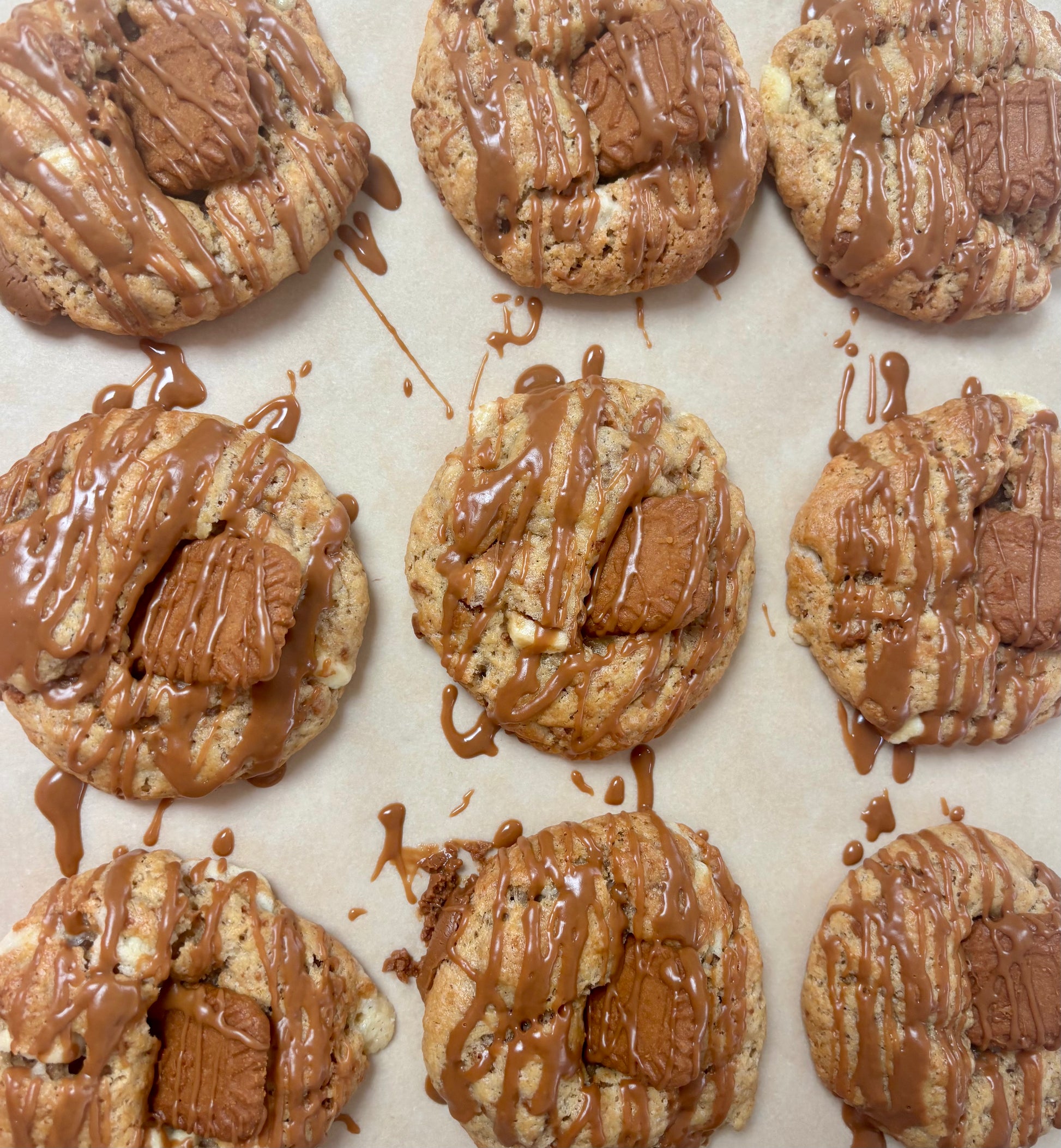 Slightly smaller than our main biscoff cookie making them perfect for parties. Drizzled biscoff cookie with crunchy biscoff biscuit and white chocolate filling throughout. Made in a fully nut-free environment they are also egg free & milk free. Soft, chewy, and allergy-friendly.